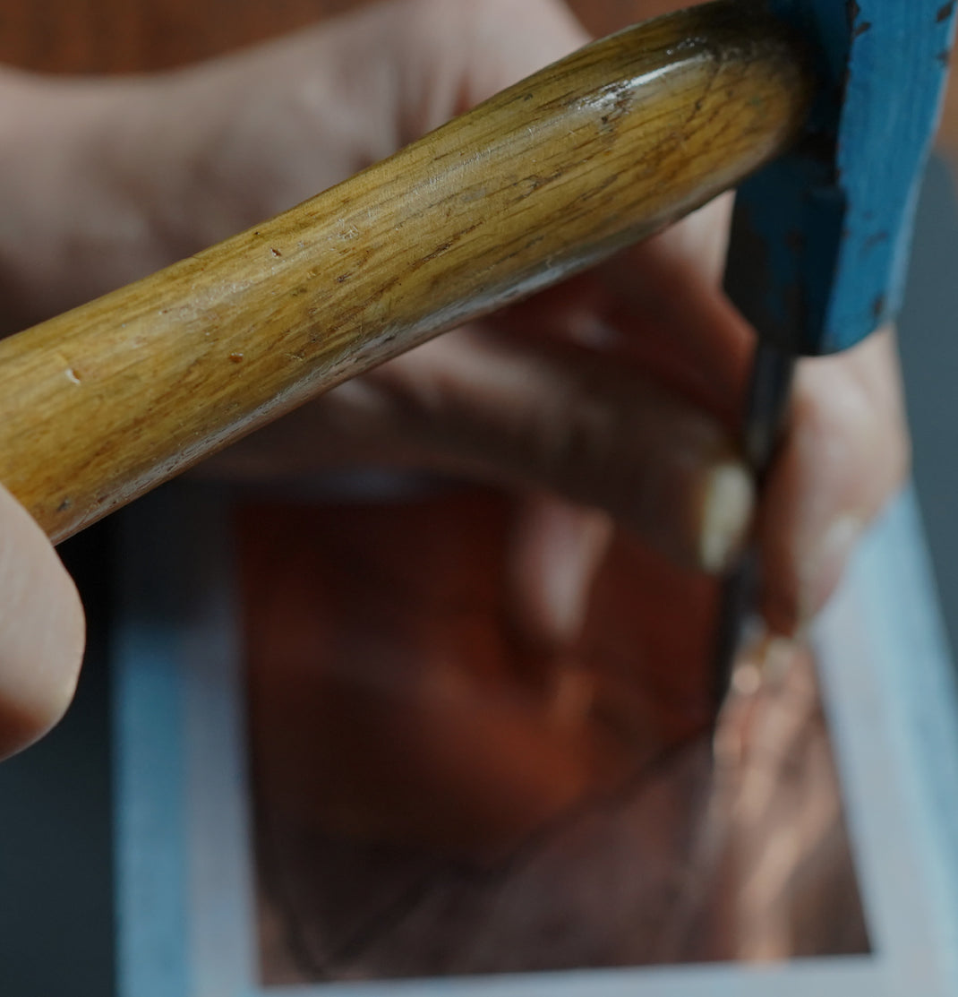 写真サイズ(L版)の銅板絵です。タガネと金鎚を使ってお好きなデザインで彫金をしていきます。