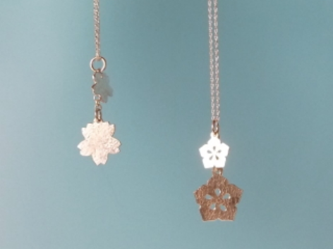 純銀の小花を糸鋸で切り出し、少し小さな小花と鎖で繋ぎ、シルバーのチェーンに通して、ネックレスを作ります。